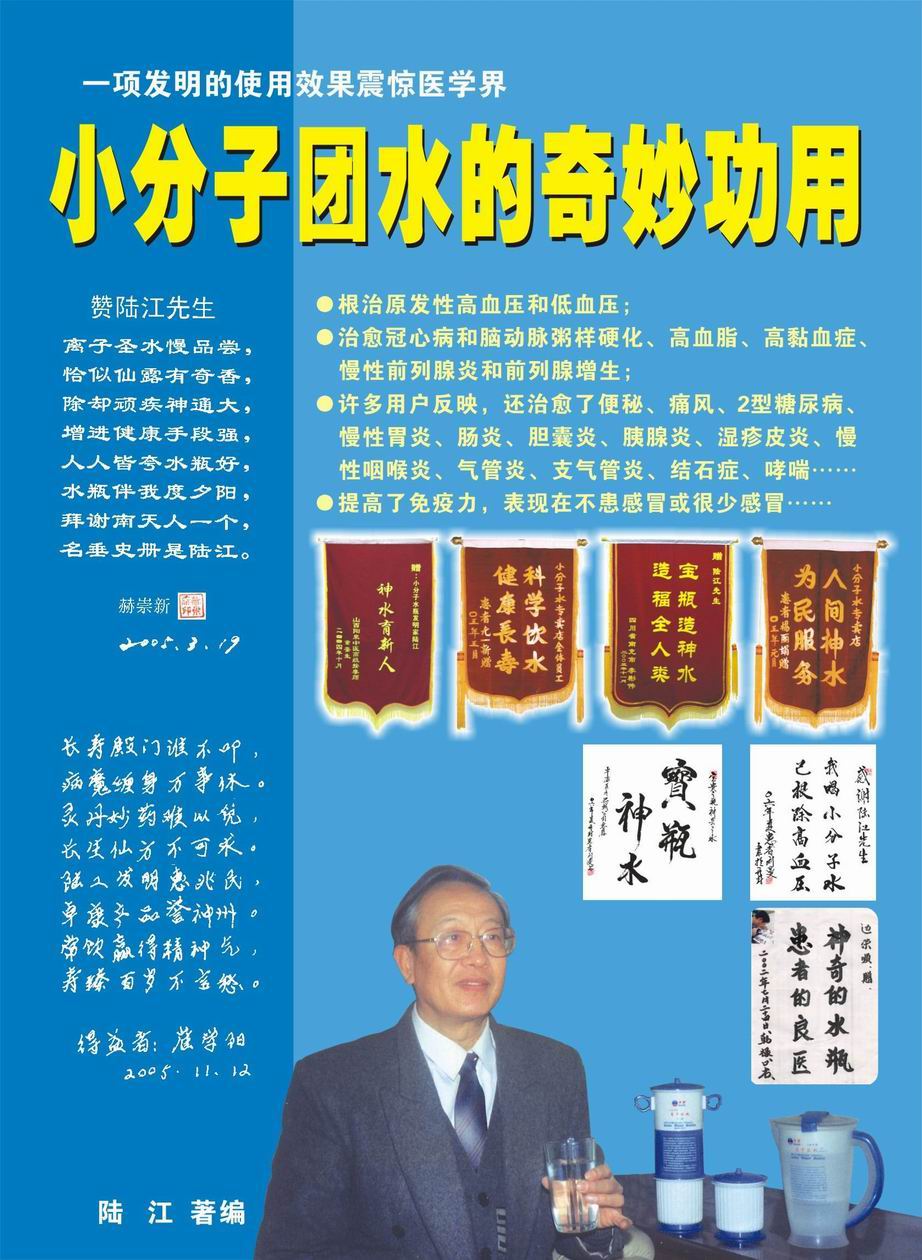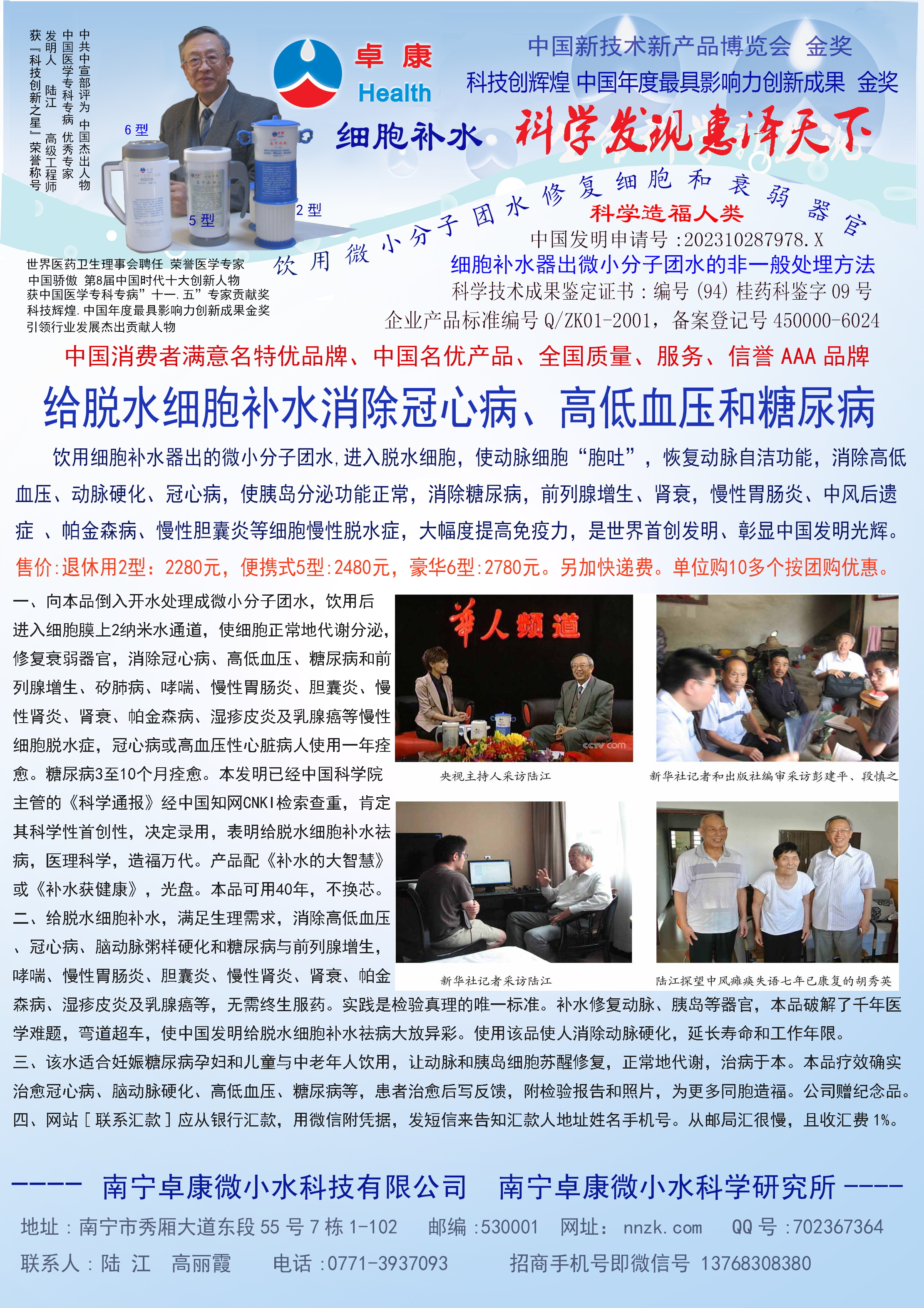 人類幾千年來患以上病癥需終生服藥,幾十年也不能治愈。可是我國南寧的高級工程師陸 江,于1990年想根治高血壓,研究發(fā)明了離子水瓶,處理出微小分子團水供飲用,經過醫(yī)院臨床試用和專家鑒定,1999年獲中國發(fā)明專利權,產品于2000年投放市場后一直跟蹤調查,據(jù)全國各地用戶反饋:祛除了高低血壓、糖尿病和冠心病,并使前列腺增生、咽喉炎、鼻竇炎、慢性氣管炎、支氣管炎、矽肺病、哮喘、慢性胃炎、腸炎、慢性膽囊炎、慢性腎炎、腎衰、膀胱炎、便秘、痔瘡、風濕性關節(jié)炎和濕疹皮炎及中風后遺癥等病癥不藥而愈。為什么喝微小水能治20多種病?陸 江從1991年德國科學家發(fā)現(xiàn)細胞膜水通道僅為2納米獲得啟發(fā),認為多種器官患病是因細胞脫水,不能正常代謝和分裂增殖,才使器官細胞減少致衰弱萎縮而形成細胞缺水性病癥。22年來的實踐有力地支持了“細胞脫水致病”這一重要論點,表明喝微小水可滿足細胞的生理需求,補水就能祛病,是生命科學新亮點。
